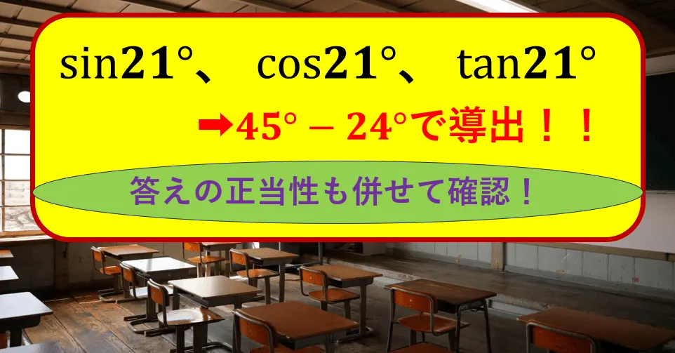 sin21°、cos21°、tan21° の値はルートを含む形で正確に求めることができます。 求め方は色々ありますが、今回は 21°=45°-24° に着目し、加法定理を利用して丁寧に導出していきます ...