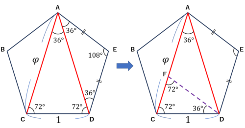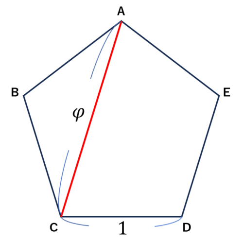 実はこの五角形の対角線の長さは、黄金比(\(\varphi\))となる、という特徴があります。